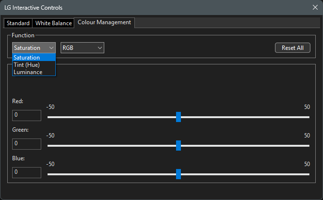 Note: The internal TPG is not affected by these controls, and altering them from their default may have unexpected consequences - The Reset Picture Mode option can be used to re-set the selected Profile and associated LUT and colour space options to the TV's defaults, where possible
