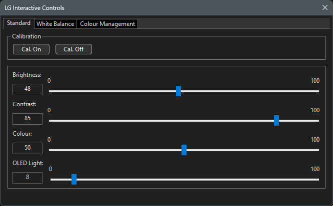 (The use of Unity Bypass Upload sets the TV into Calibration mode, including setting the selected Profile slot, and disables selected TV on-screen controls, as defined below) - If required, the TV's Brightness, Contrast, Colour, and OLED Light can be adjusted using the Interactive Controls while taking interactive measurements via the Manual Measure menu